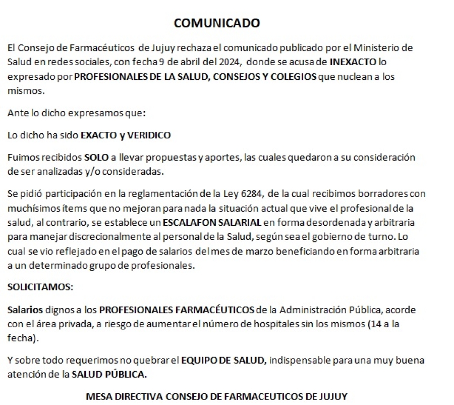 El Consejo de Farmacéuticos de Jujuy rechaza el comunicado publicado por el Ministerio de Salud en redes sociales, con fecha 9 de abril del 2024, donde se acusa de INEXACTO lo expresado por PROFESIONALES DE LA SALUD, CONSEJOS Y COLEGIOS que nuclean a los mismos. Ante lo dicho expresamos que: Lo dicho ha sido EXACTO y VERIDICO